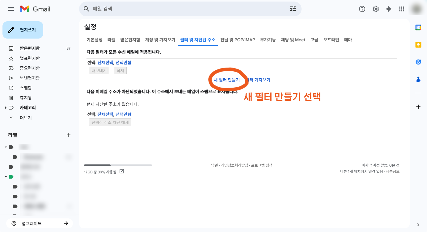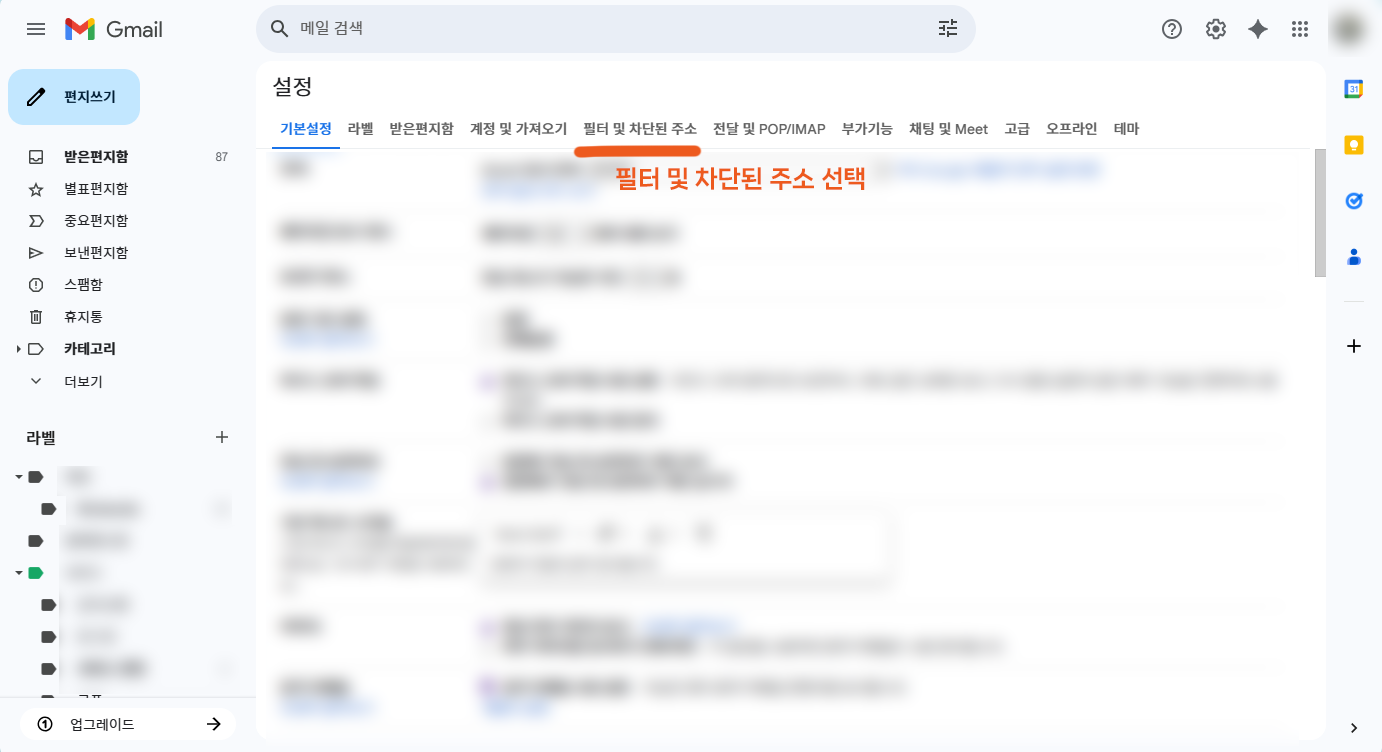 - 설정 메뉴 중 “필터 및 차단된 주소” 탭 클릭