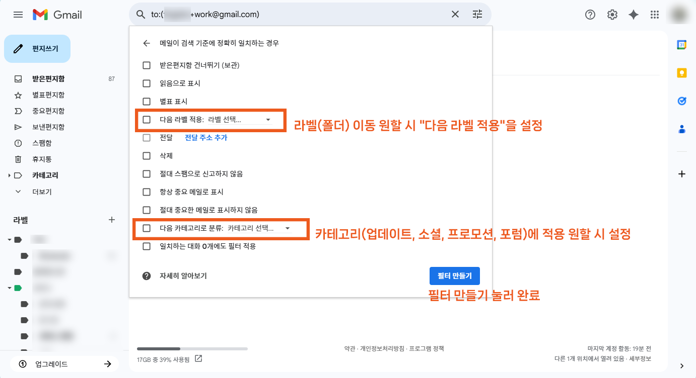 라벨을 적용하거나, 카테고리를 적용하는 등의 옵션 등을 선택해서 메일을 수신할 방법을 커스텀해보세요.