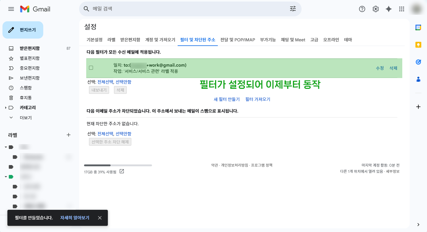 - 새 필터 만들어 레이블을 설정해두면 본계/부계 메일을 구분해서 자동으로 관리할 수 있음