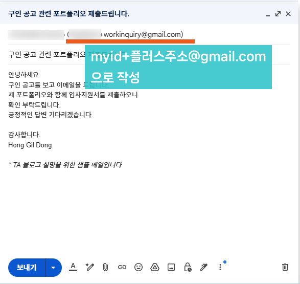 받는사람 영역에 <내 이메일 주소명+플러스 네이밍@gmail.com>로 입력해서 완성하고,