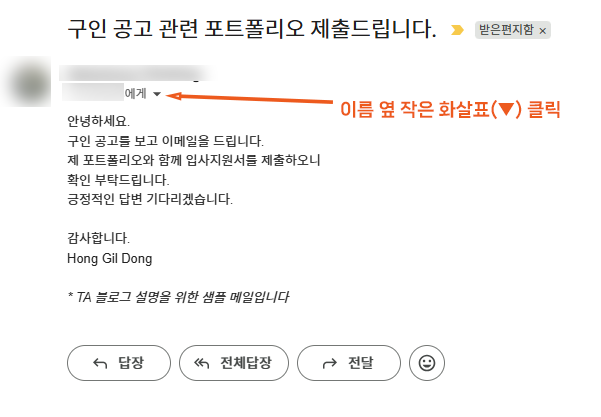 - 수신 이메일 열기 → “받는사람(To)” 확인