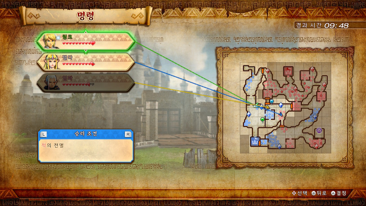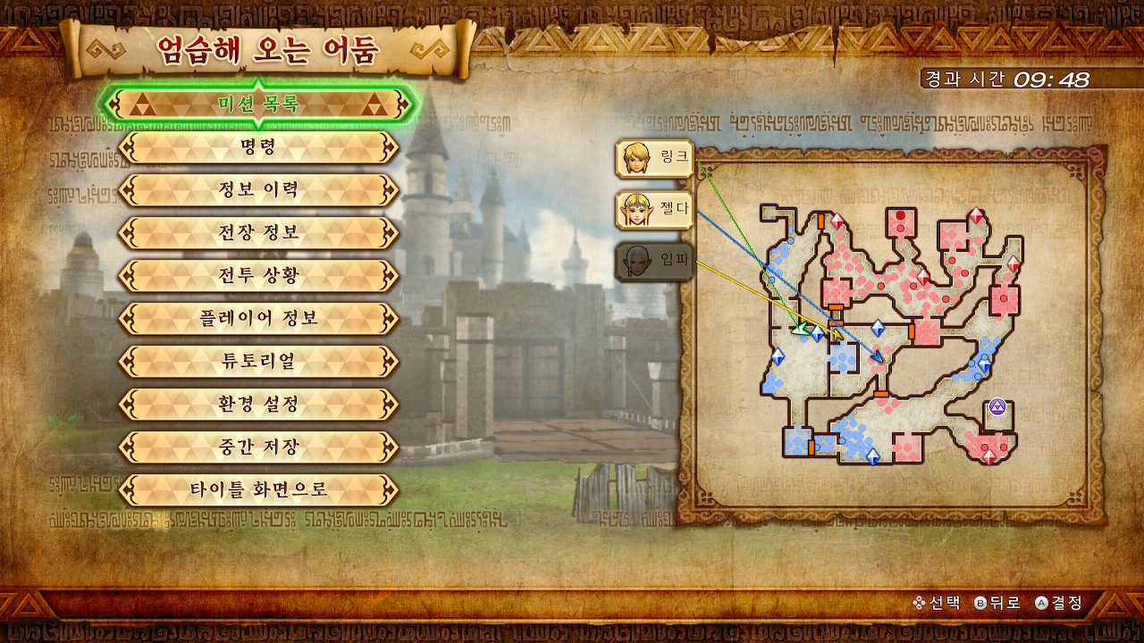 레전드 모드의 엄습해 오는 어둠이고, 링크와 젤다, 임파가 전투에 참전하고 있어요.