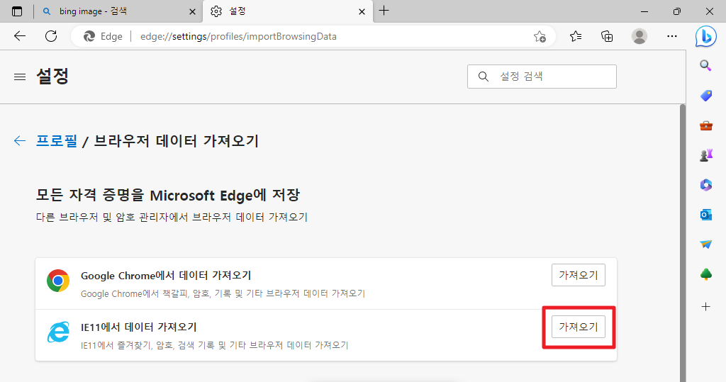 3. “IE11에서 데이터 가져오기”에서, 가져오기를 누릅니다.