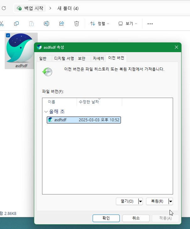 파일 히스토리 대상인 폴더에 있는 파일을 우클릭하고 속성을 누른 뒤, 이전 버전 탭을 열면 복원 가능한 시점의 항목들이 표시됩니다.
